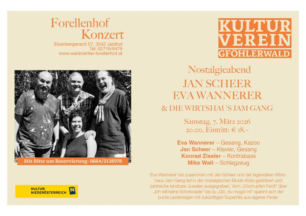 Auch 2026 wird der Kulturverein Gföhlerwald zahlreiche Konzerte im Waldviertler Forellenhof veranstalten: